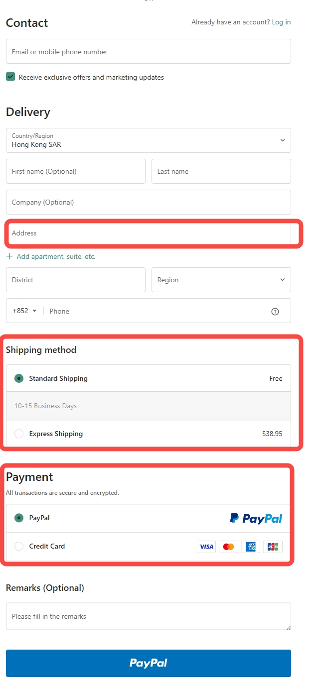 - PayPal: If you have a PayPal account, this is the fastest way to check out. Just pay directly by logging into your PayPal account. You don't even need to enter address information and log in to our website, you can use PayPal to place orders quickly and safely. But please make sure your PayPal delivery address is accurate because the order will be delivered according to.