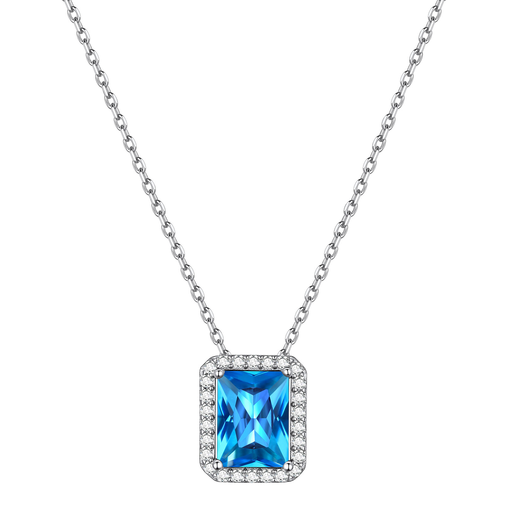 Square Emerald Cut Cubic Zirconia Halo Pendant Birthstone Necklace for Women, march birthstone, Aquamarine Pendant, Pisces Birthstone, Aries Birthstone, sterling silver jewelry, gift idea